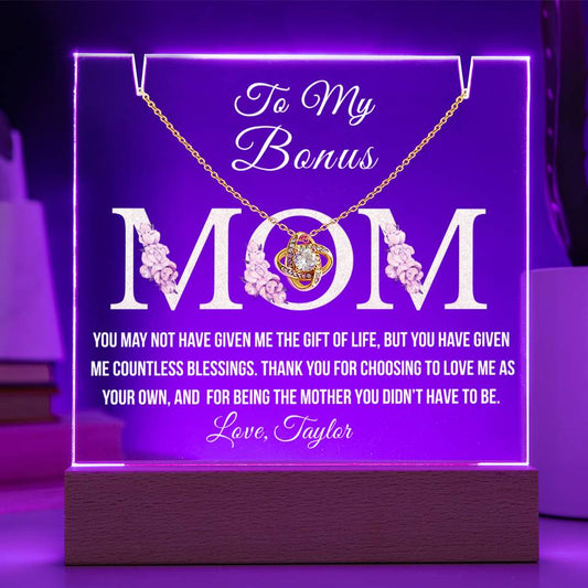 Bonus Mom Acrylic Plaque with Necklace – Heartfelt Stepmom Gift from Stepdaughter or Stepson – Thank You for Loving Me as Your Own