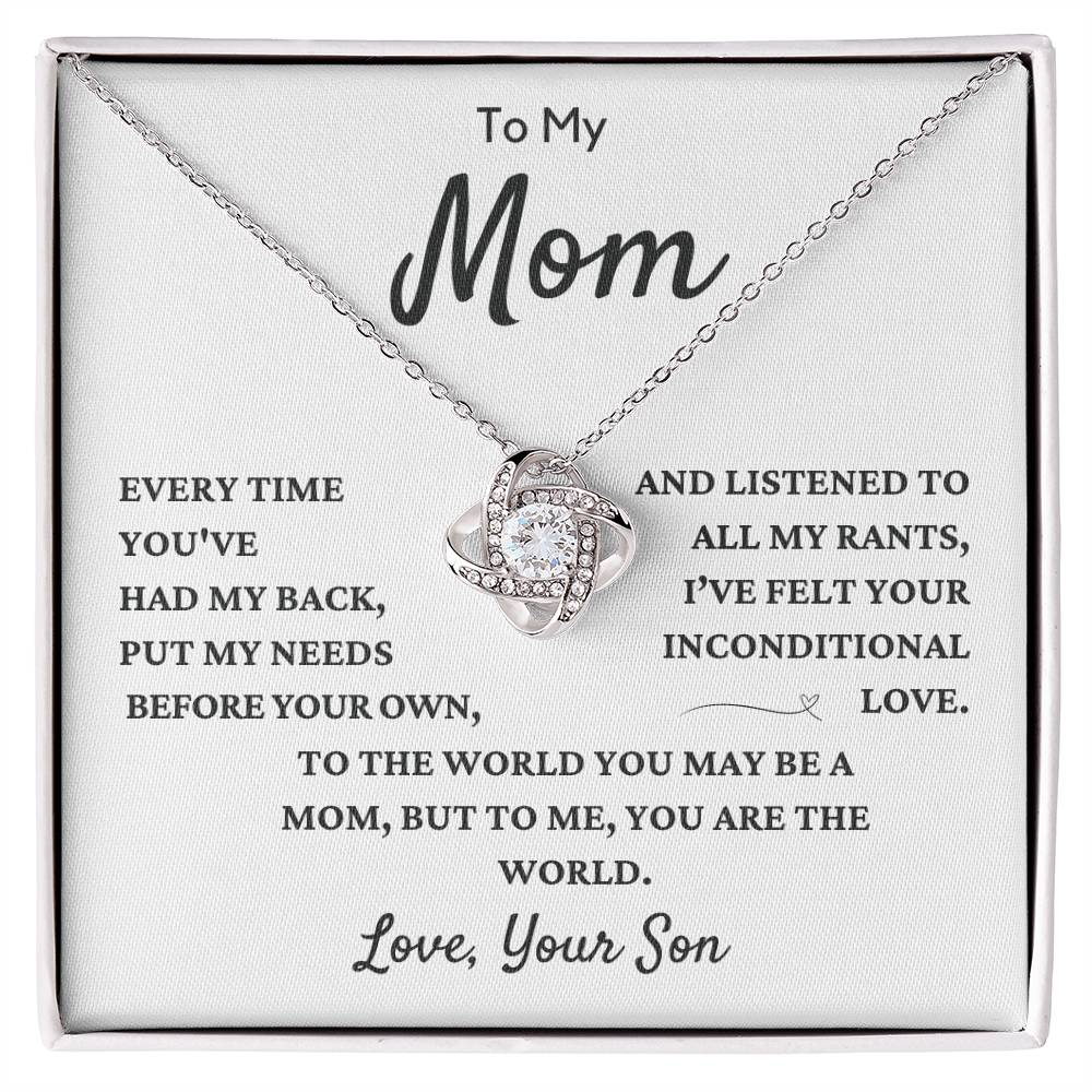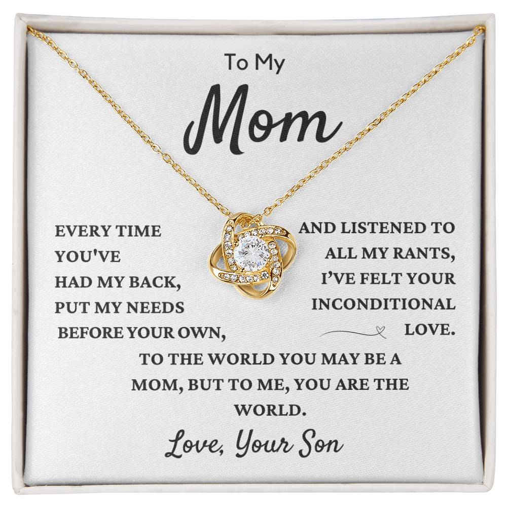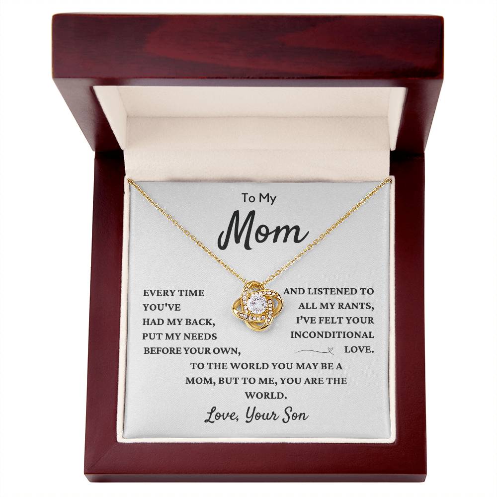 EVERY TIME YOU'VE HAD MY BACK, PUT MY NEEDS BEFORE YOUR OWN, AND LISTENED TO ALL MY RANTS, I'VE FELT YOUR INCONDITIONAL LOVE. TO THE WORLD YOU MAY BE A MOM, BUT TO ME YOU ARE THE WORLD. Love, Your Son.